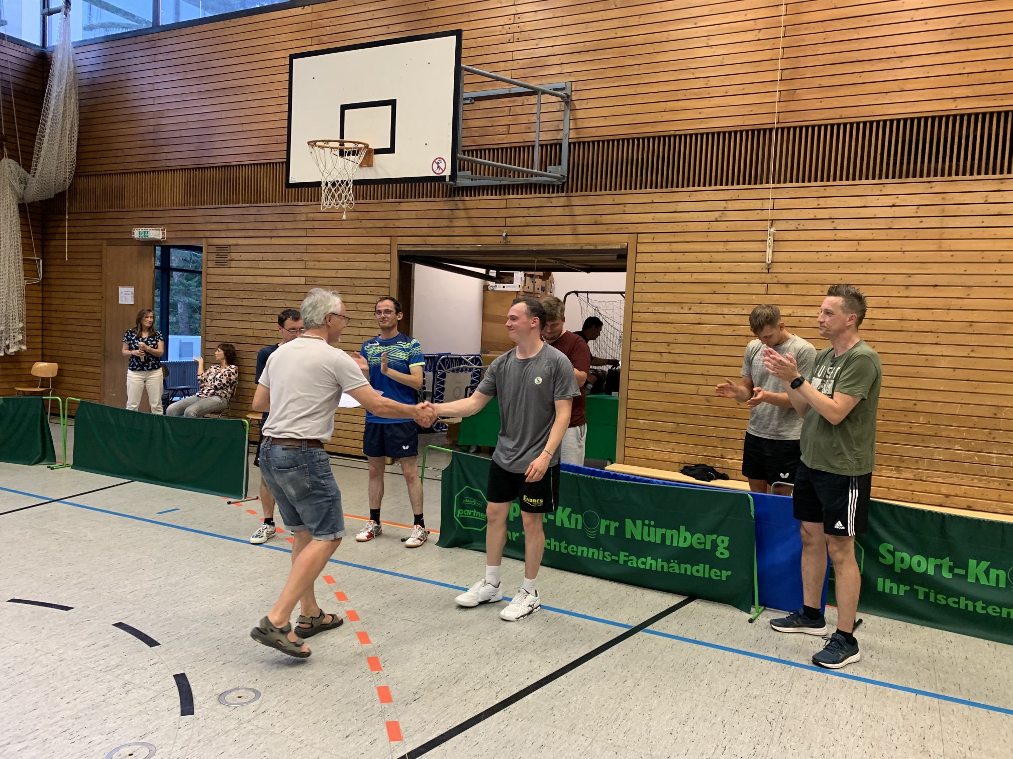 Der Auftakt des Turniers wurde traditionell durch die D-Klasse bestritten die am Samstag um 11:30 Uhr startete. Die Startplätze dieser Klasse sind immer besonders begeht, so dass bereits vor dem Turnierstart alle 40 Plätze ausgebucht waren. Durch anfängliche technische Probleme konnte der Start der Klasse leider erst etwas verzögert beginnen. Nach einem sehr langen Turniertag konnte sich hier im Einzel-Finale Steve Häde (TTC Höchstadt/Aisch) gegen Erdem Ören durchsetzen. Das Doppel entschieden Igor Kovaltsov und Aleksandr Volochaev (beide TSV Maccabi Nürnberg e.V.). Herzlichen Glückwunsch an die Gewinner.