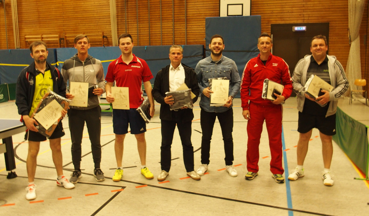 Zum Abschluß des ersten Spieltages begannen dann gegen 15:30 Uhr die Spiele in der A-Klasse. Hier wurde den Zuschauern von den 26 angetretenen Spielern großes Tischtennis präsentiert. Hier konnten letztendlich Karsten Reiß (TV 1848 Erlangen), Tobias Ehret (TSV Windsbach), Florian Hartig (DJK Sparta Noris Nürnberg) und Hernán-Benjamin Soto Torres das Halbfinale erreichen. Hier konnte sich Soto Torres glatt mit 3:0 gegen Reiß durchsetzen. Im 2. Halbfinale konnte Ehret ebenso glatt gegen Hartig punkten. Beim Showdown im Endspiel setzte sich dann Ehret mit 3:1 Spielen (12:10, 11:9, 5:11 und 11:3) doch klar gegen Soto Torres durch.