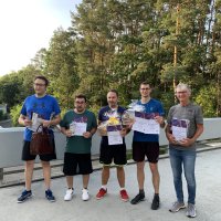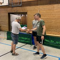 Ein spannendes Finale entwickelte sich im Doppel. Hier trafen Timo Neumann (SV Weiherhof e.V.) und Karsten Reiß (TV 1848 Erlangen) auf Janik Welsch (CVJM Unterasbach) und Marius Zaus (DJK SpVgg Effeltrich) aufeinander. Bei den ersten beiden Sätzen konnte jedes Team einmal mit 11:9 Bällen jeweils einen Satz gewinnen. Die nächsten beiden Sätzen teilten sich beide Doppel wieder unter sich auf - diesmal mit je 11:8 Bällen. Mit dem 5. Satz konnten schließlich Welch / Zaus den Pokal erobern.